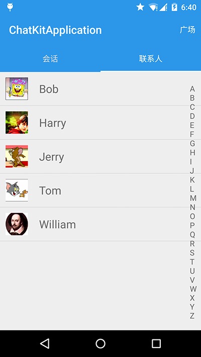 因为 ChatKit 是与应用的用户体系完全解耦的,所以 ChatKit 中并没有包含联系人列表页面,但部分开发者可能有此需求,所以 chatkitapplication 实现了一个基于 LCChatProfileProvider 的联系人列表页面,具体代码可以参考 ContactFragment.java, 具体效果如下: